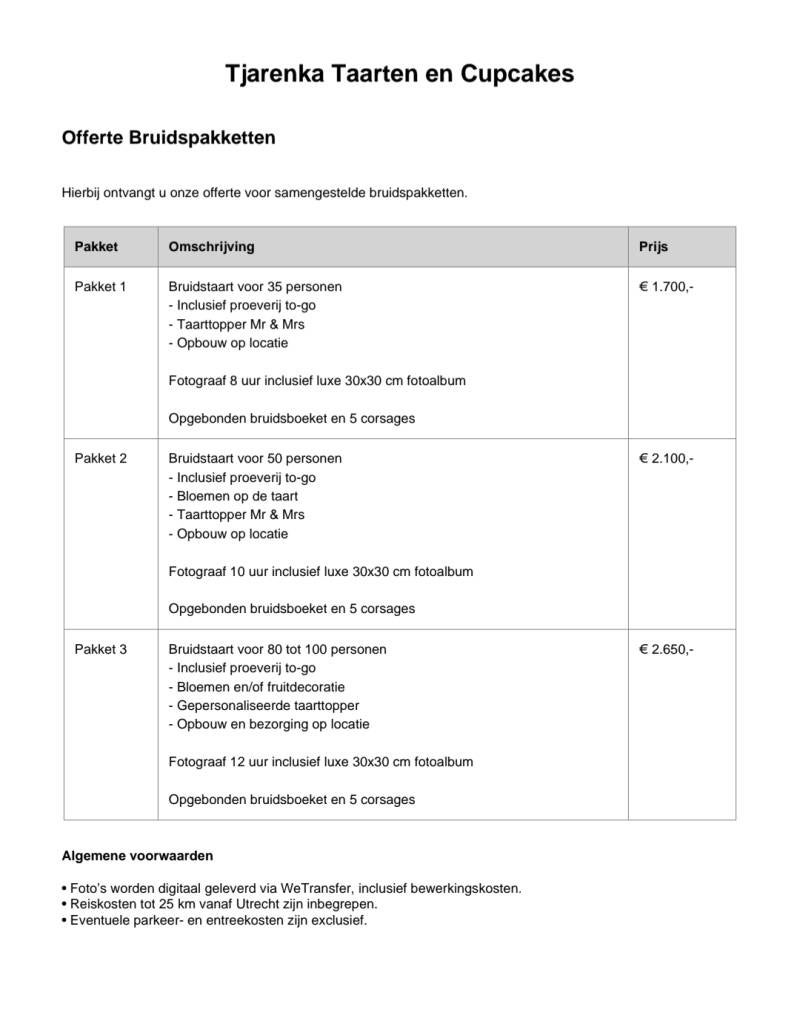 Voor zowel de normale maat bruidstaarten als de hoge bruidstaarten zit het volgende bij inbegrepen: